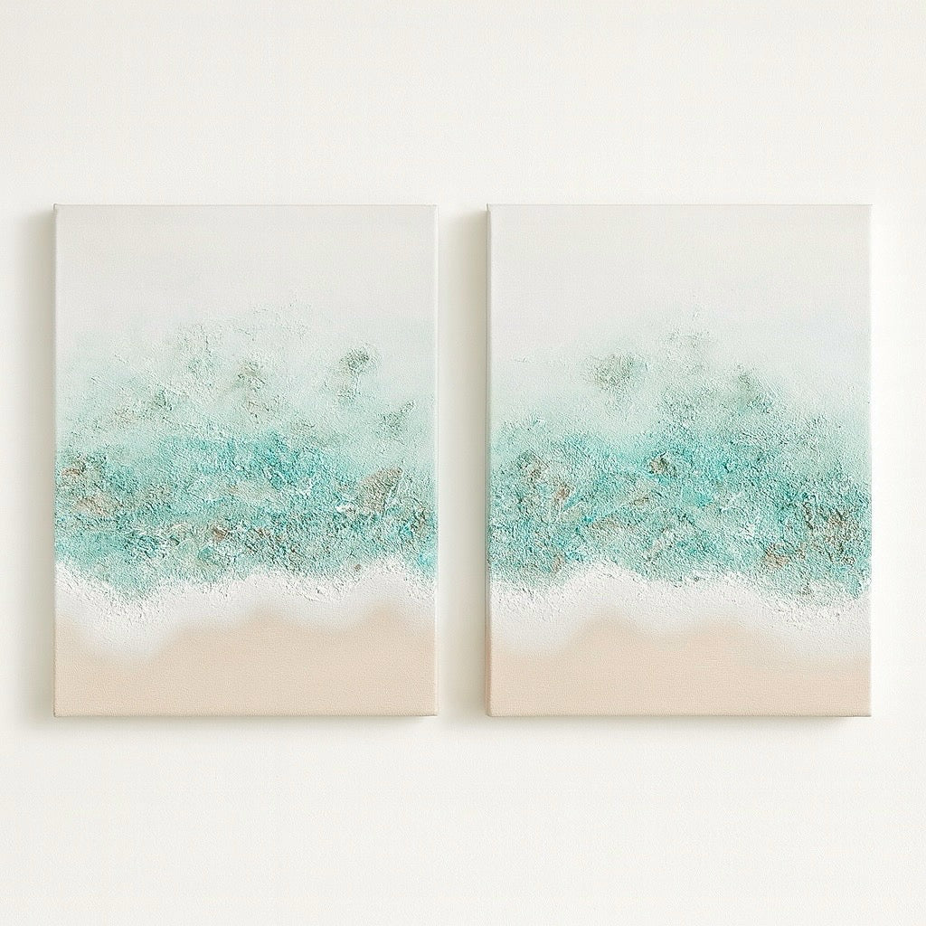 “Mar de arena y sal” es un lienzo de algodón trabajado con pintura acrílica y delicadas texturas que evocan la serenidad del mar. Los tonos suaves de beige, blanco y azul se funden como arena, espuma y agua en un horizonte tranquilo. Cada trazo y relieve invita a imaginar la brisa marina, el sonido de las olas y la calma infinita de la orilla. Una pieza que transmite paz y conecta con la esencia natural del mar.